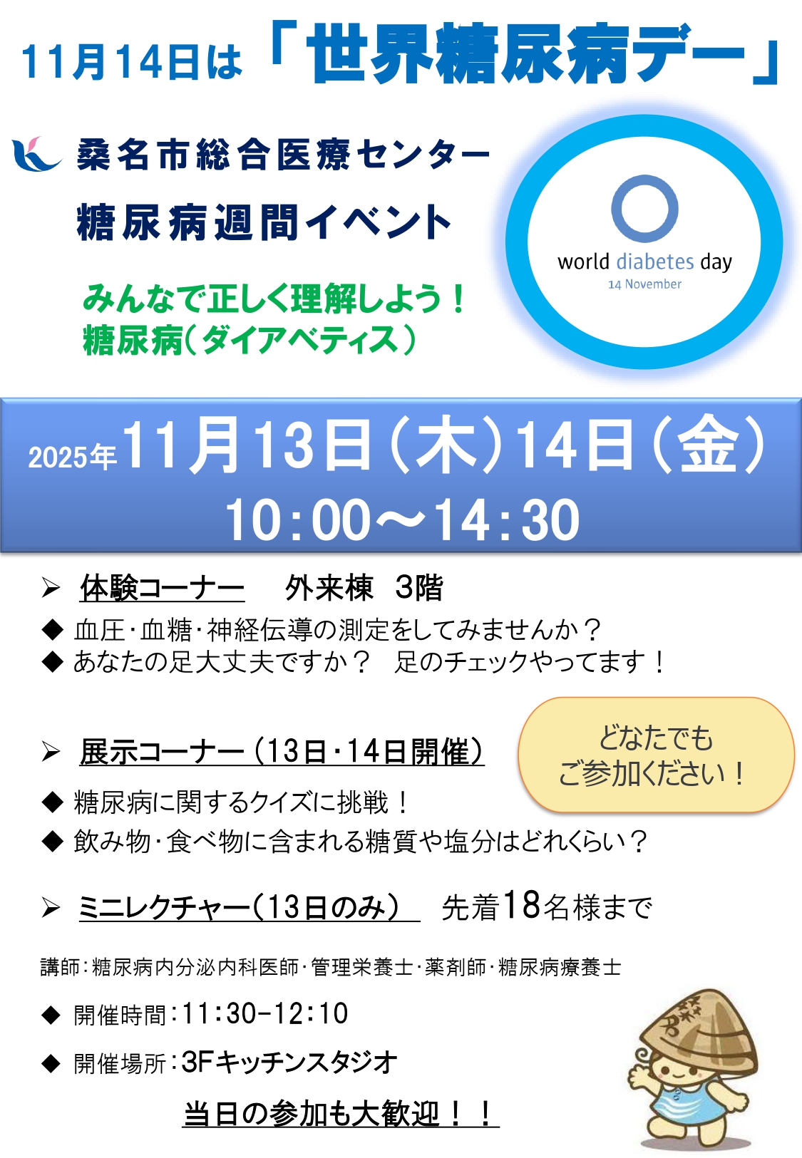 「世界糖尿病デー」イベントのお知らせ イベント R07.10.06 11月14日は「世界糖尿病デー」です。当センター糖尿病週間イベントとして、11月13日(木)14日(金)に下記のイベントを開催します。 是非みなさまお越しください!!