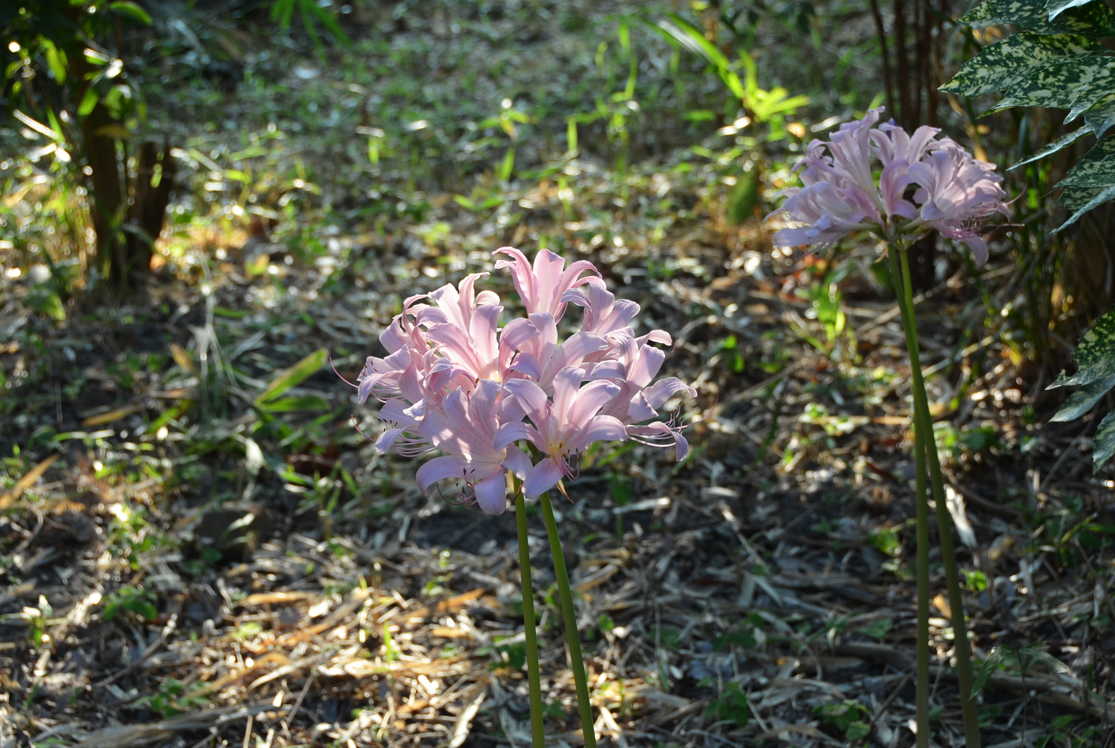 さて今月の花は、先月お約束しました夏水仙(ナツズイセン)です。葉が水仙に似ているからこの名が付いたのですが、華麗な花は無視されて不本意にネーミングされた気の毒な花です。夏水仙は、ヒガンバナ科ヒガンバナ属の多年草(水仙も同じヒガンバナ科ですがスイセン属です)、お盆前後より50~60cmほどの真っ直ぐな花茎を伸ばし、先端に桃色の美しい花を4個ほど咲かせます。ヒガンバナの仲間ですから、花と葉は別々に現れます。彼岸花では花が枯れた後に葉が出て冬を越しますが、夏水仙では、春に葉が出て枯れた後に花が咲きます。