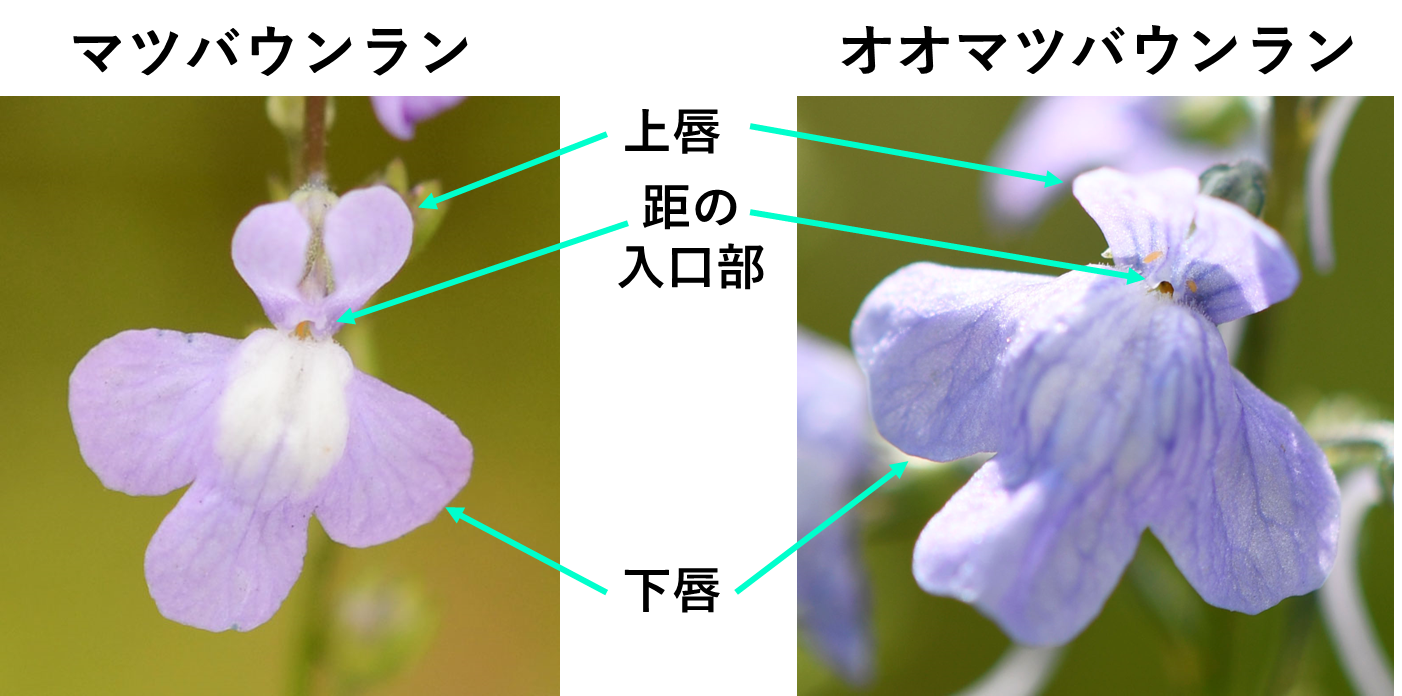 マツバウンランもオオマツバウンランの花も、上唇と下唇の2枚の花弁からなり、下唇の中央部は盛り上がっています。盛り上がった部分が、マツバウンランでは白いのですが、オオマツバウンランでは白くなく、花弁全体に紫色のストライプが目立ちます。どちらも上唇と下唇の接合部に距が開口します。